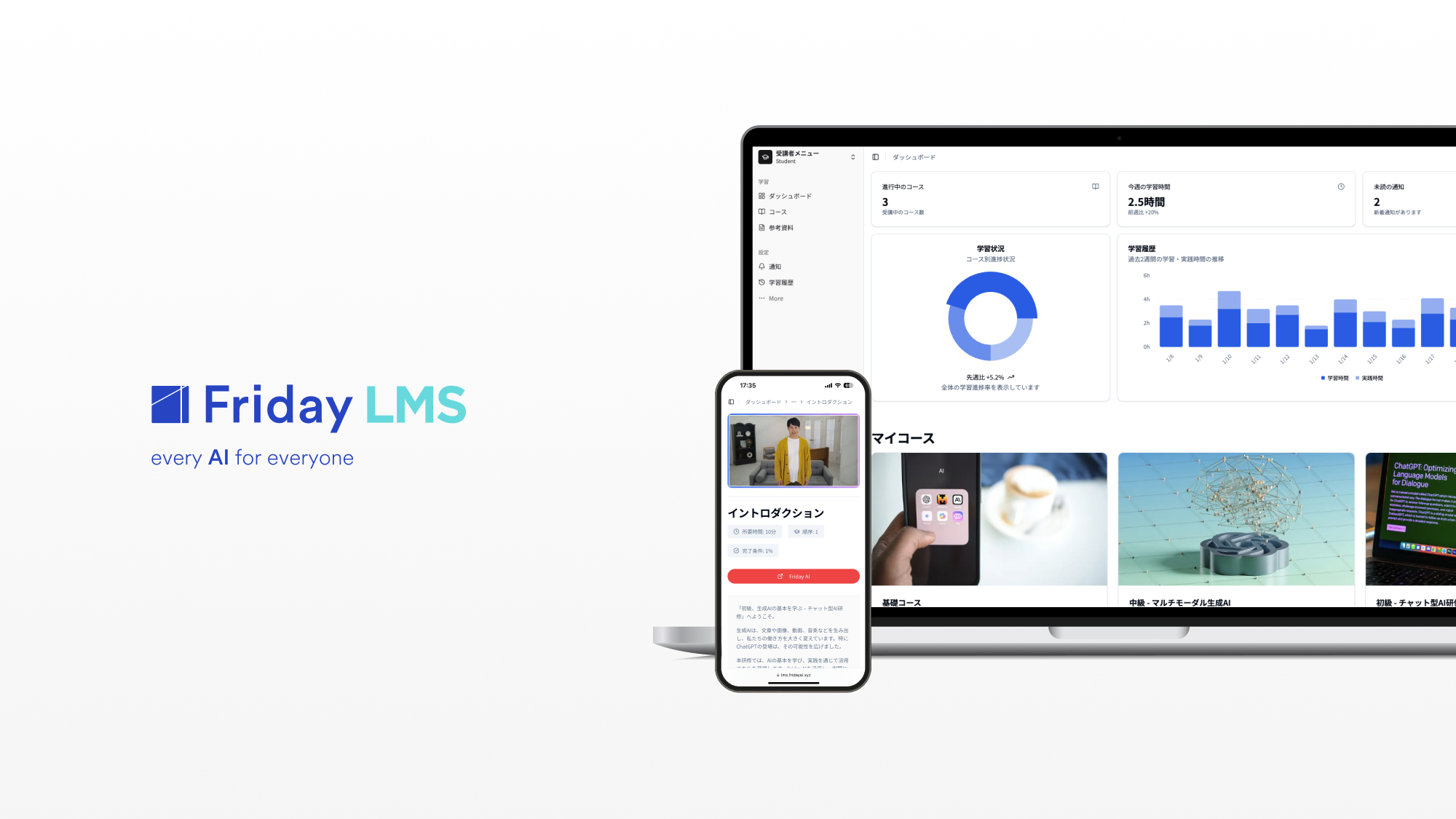 - 生成AI研修「Friday LMS」をお申し込みいただいた企業および受講者となる従業員の方のみご利用いただけます。